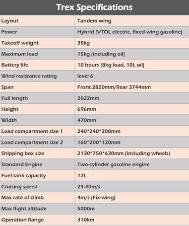 Trex® is a 35kg gasoline hybrid tandem-wing vertical take-off and